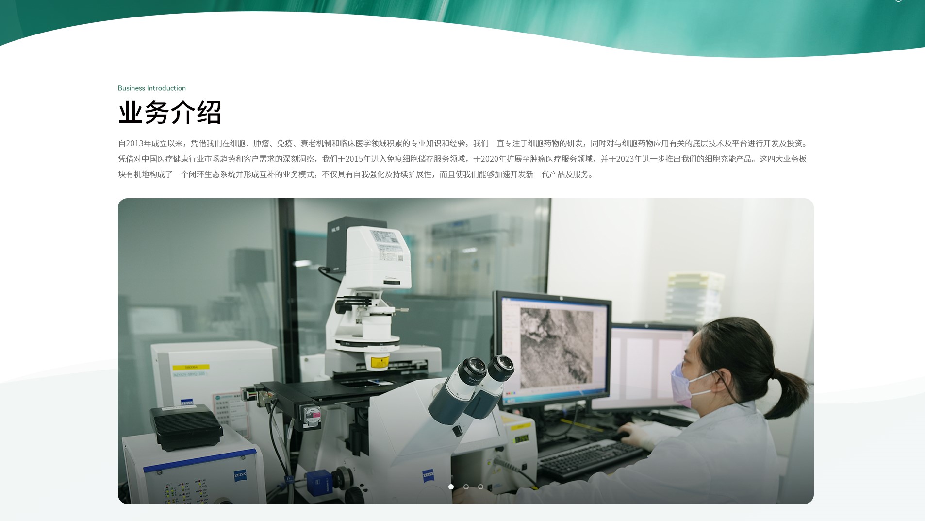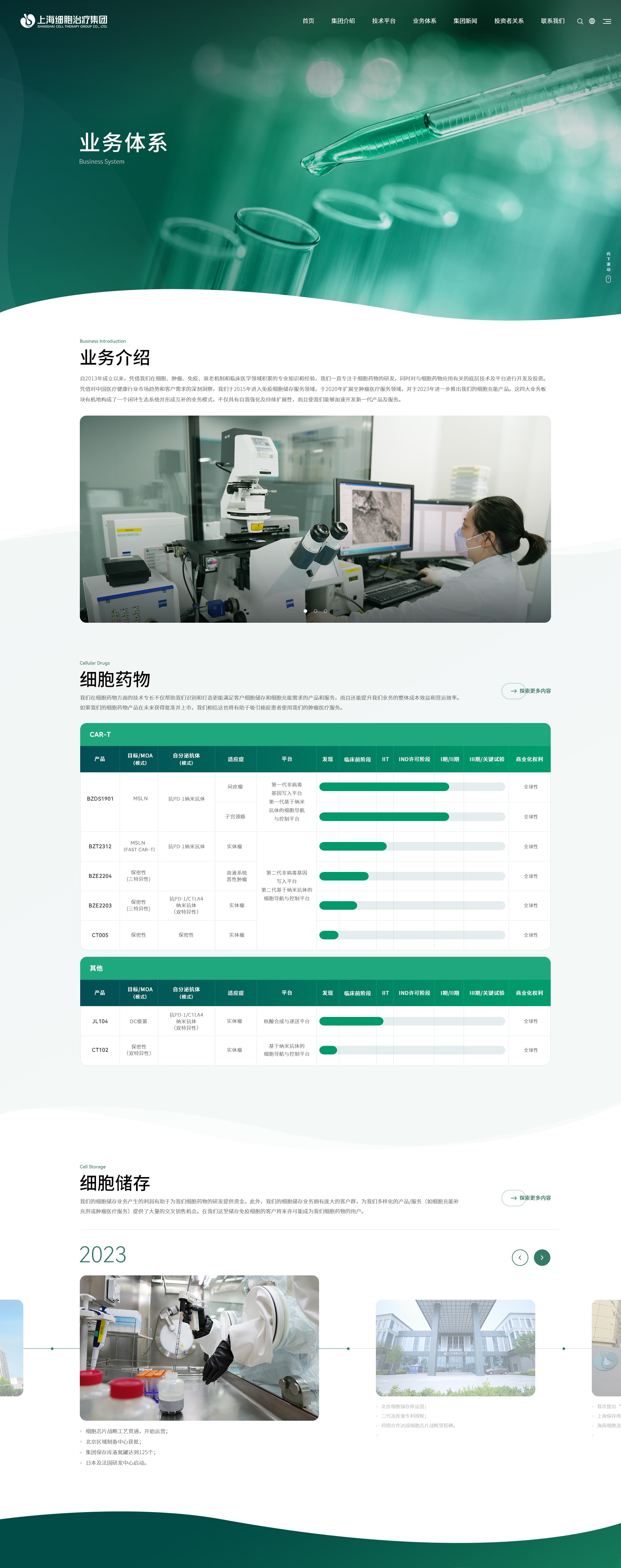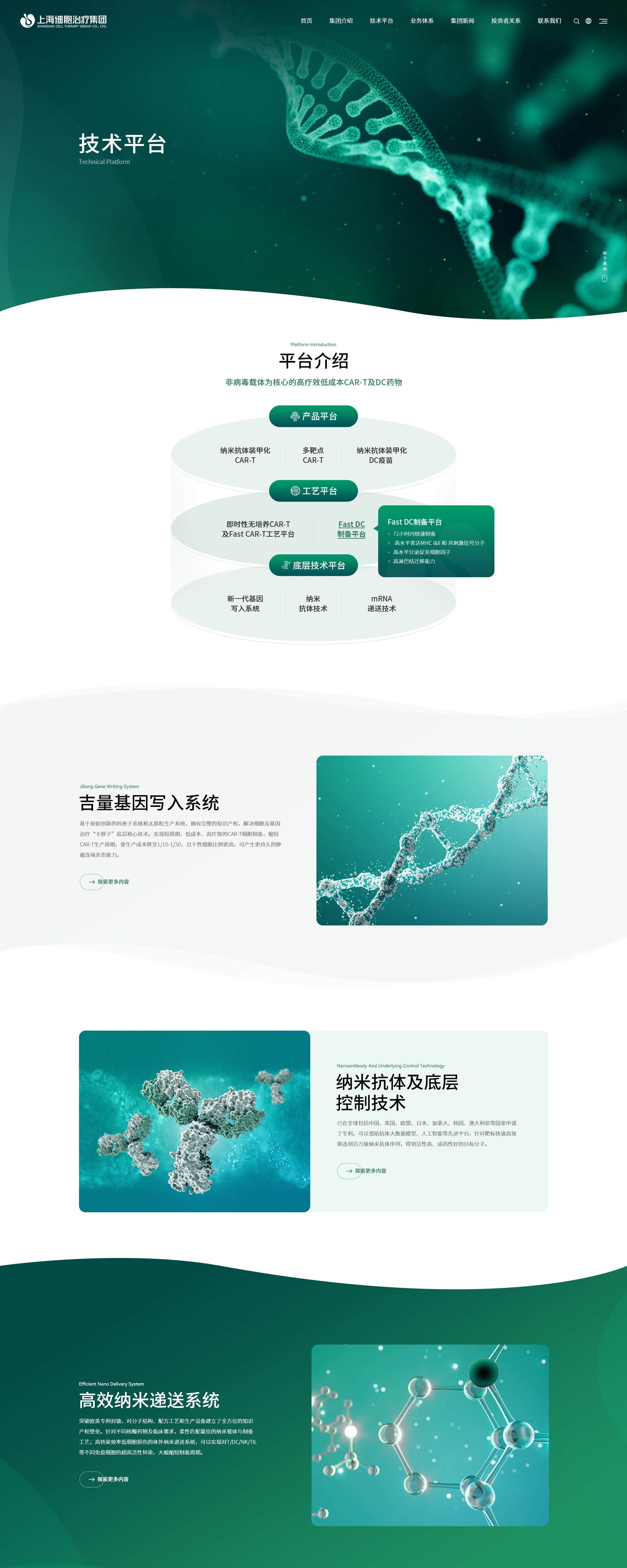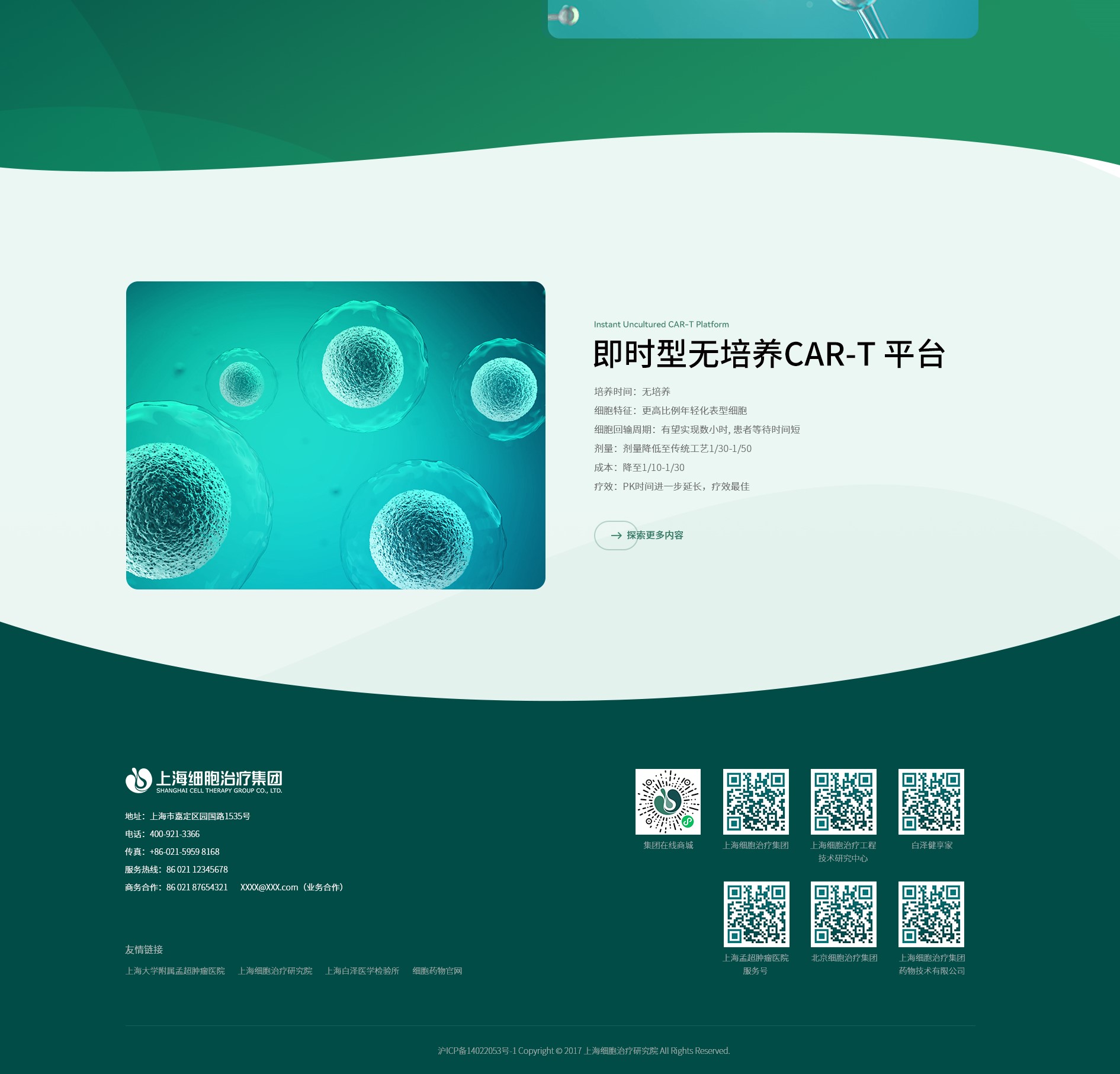 上海細胞網站以科技感、專業性、創新力與人文關懷為核心風格定位,旨在全麵展現企業在細胞治療領域的領先地位與創新實力。設計上,網站采用綠色為主色調,傳遞出科技感與專業性,輔以白色背景和深綠色點綴,營造出寧靜、清晰且富有生命力的視覺氛圍,彰顯企業在生命科學領域的深厚底蘊與創新實力。